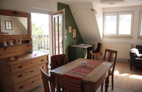 We offer in our house to an apartment on the first floor with separate entrance. The studio is about 40 square meters in size, light and bright with a large, partly covered roof terrace. You have a wide view south to the Pegnitzauen. The equipment is high quality, partly with old furniture.