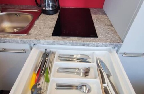 You will also have a useful and spacious wardrobe in this area, which is illuminated by a window. When you want to prepare a nice breakfast or dinner, the red kitchenette with all kinds of kitchen utensils, especially the refrigerator, microwave, coffee maker, and the dining table for two will always be a few steps away from you. And the modern, delicately designed bathroom is the ideal place to start a great day or unwind. Moreover, thanks to the Hadersdorf/Kamp Bahnhof train station right next to you, it will be your privilege to reach Vienna whenever you want and quickly.