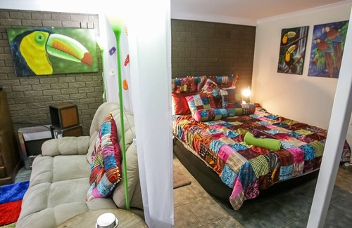 Our studio apartment celebrates fun and vibrancy! It is decorated with colourful artefacts collected from journeys and visitors from around the globe. The spacious apartment, under the main house, has a comfortable queen bed at one end, with a folding bed also available. There is an open plan lounge and dining area, kitchenette and bathroom with shower and toilet.