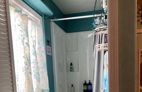 The on-demand hot shower always has plenty of hot water and a supply of fresh, fluffy towels. We built a grey water system so your shower water is helping to water our urban homestead orchard - fruit trees just outside your door.