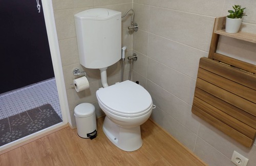 Due to environmental concerns, the room is cleaned with vegan products, and the various available utensils are eco-friendly. Additionally, upon arrival, you will find vegan products (liquid soap, body wash, and shampoo). The toilet has water efficiency. The faucets are equipped with a system to reduce unnecessary water consumption, and the water is heated by heliothermal energy (solar thermal).