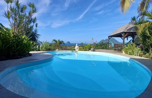 Garden level studio in a tropical garden with swimming pool to cool off and panoramic views of the rock and the diamond bay. Fully equipped with kitchenette table and benches. The studio has a double bed, a sofa bed a place in second bed; a bathroom with toilet. Sheets and towels are provided. It is air conditioned, you have TV and wifi available.