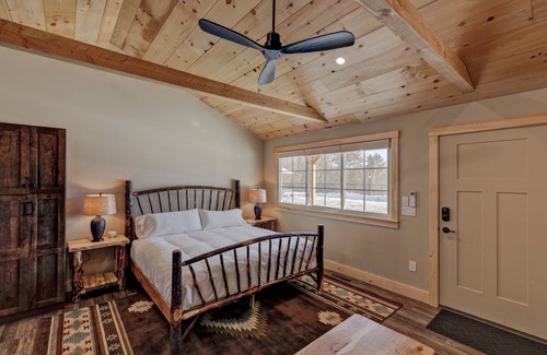Indulge in the luxury of one of eleven exclusive suites at the Lodge by Sunapee Stays, nestled in the heart of Sunapee with breathtaking vistas of Mount Sunapee just steps from your doorstep. This contemporary rustic studio suite is adorned with hickory log furniture, offering a cozy retreat for guests. Relax in a plush king bed or make use of the full-size memory foam sofa bed for additional comfort.