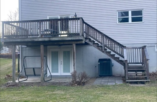 Spacious 900 sq foot private entrance basement with pellet stove, queen size bed, two single beds, couch, dresser and drawer, small table for eating or coffee, 55-inch LG TV with cable and streaming options, Keurig coffee maker with coffee provided. Leather couch, highchair, hairdryer, towels and linens provided, bathroom with sink, toilet and walk in shower, as well. Swing on the back patio, flowers in abundance, Community Yard of the Year winner 23 straight years in a row.