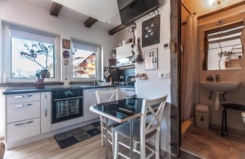 Studio Sivka is a small nest for two people, but it has everything that a big one has. The bedroom, kitchen and dining room are in one room, while the bathroom and toilet are in another room. The outdoor terrace offers a view of the surrounding Julian Alps.