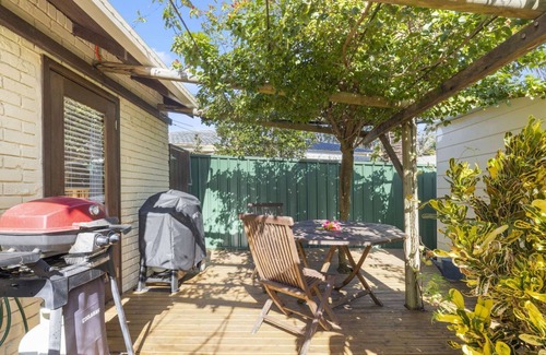 The studio is located on the ground floor and has a kitchenette, queen bed, wall-mounted TV, dining table seating two, a separate private bathroom and laundry facilities. The bathroom is equipped with a basin, toilet and shower. A french door opens up onto a deck with a BBQ, seating area and shared access to the shared pool and pool house. The studio is also suitable for those with mobility concerns as it is all on one level.