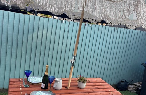 We have a lovely fenced garden with a picnic bench and umbrella for your use.