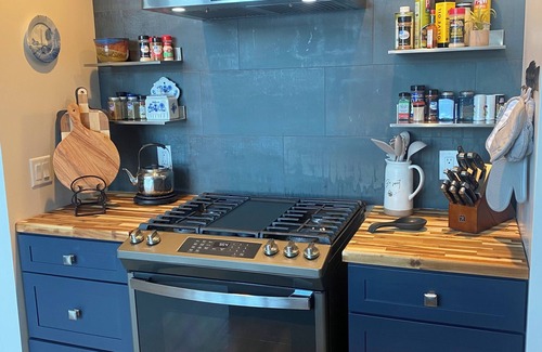 You will enter the home from the main floor roadside entrance. The main floor has a laundry room with a full size washer and dryer and laundry folding table, as well as a large master bedroom and a spare bedroom on either side of the entry hallway. Both of these comfortable bedrooms have great natural lighting, wall mounted TV’s, luxurious bedding, and beautiful views. The master has a large walk-in closet. The main floor bathroom can be accessed through the master bedroom or hallway and is equipped with a handicapped shower. You then enter the great room, kitchen, and dining area. This space has a 22 foot cathedral ceiling with two large ceiling fans. The living room has a comfy sectional sofa, large TV, coffee table with storage (filled with games and puzzles), and a separate reading area with a custom bookcase filled with a variety of books. There is a desk/work station in the great room if you have to work from home. The gourmet kitchen has a large butcher block island which seats four and is great for casual dining or as a food prep area. The kitchen has a gas range, fully vented hood, quartz countertops, farm sink, under cabinet lighting, ample cabinet and storage space, and a walk-in pantry. The kitchen is fully stocked with quality cookware, bakeware, chef’s knives, plates, glasses, silverware, serving platters and bowls and anything else you may need during your stay. The dining area seats six and is beside a coffee and tea bar. You can enjoy your morning coffee or evening cocktail while listening to the waves and watching the calming waters of Lake Superior.