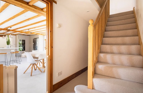 SCOTLAND END BARN is designed for sustainable, comfortable living with biomass boiler, heat pump and solar panels as well as character and architectural features like the amazing water well which has feature lighting, exposed beams, high vaulted ceilings, cut stone arched doorways and stone mullion windows. The house is flooded by light with full-height glass windows; the majority of rooms enjoy dual-aspect views of the gardens. The house occupies its own 1 acre plot with a separate garage and third lounge/games room above.