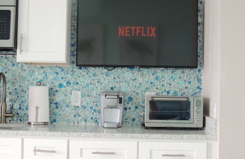 The kitchen features all new stainless-steel appliances including a cooktop, a full-size refrigerator with ice maker, and an over the cooktop sensor microwave. It is fully stocked with small appliances such as a blender, countertop oven, and Keurig. All of the cooking utensils and accessories you could ever need to make the perfect meal, as well as complete dining service for eight are provided. The cabinetry is brand new and features ample storage space and soft close hinges. The counter tops are a stylish, modern solid-surface.