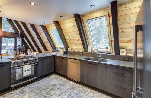 A-FRAME FEATURES: 2 Smart TVs, wood-burning stove, dining table, loft w/ sitting area, ground-floor family room, soaking tub, books, board games, floor-to-ceiling windows w/ forest views, contemporary furnishings & decor