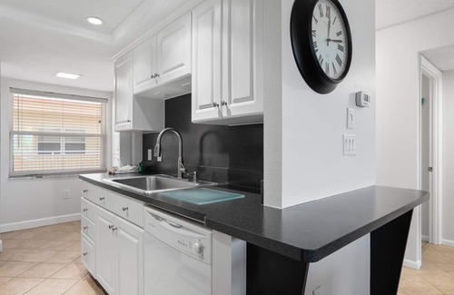 Guests will thoroughly enjoy the modern kitchen, complete with new countertops and matching backsplash, appliances and fully stocked with all utensils needed for your stay. The living room, in soft neutral colors, provides plenty of seating space and large flat screened television. Step out to the large balcony and take in the tranquil ocean views. This is a great place to relax and enjoy the one of a kind Florida sunsets. The master bedroom, with access to the balcony, has one queen bed, television and plenty of closet and dresser drawer space. The guest bedroom has two twin beds and flat screened television, making this perfect for families with children. Linens, extra towels and pillows are stocked for your visit, as well as a washer and dryer. Please note that lost fobs will incur a replacement fee of $250, or the withholding of the equal security deposit, depending on the method of booking.