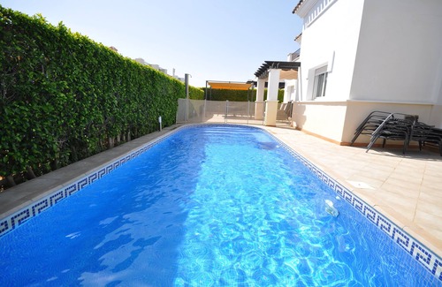 Stunning 3 Bed South Facing Villa/Bungalow with private jacuzzi and optional heated pool. All bedrooms are on the ground floor. 1 Bedroom En-suite plus a 2nd Bathroom. All Rooms have Air Con (inverted) and Ceiling Fans. Superb central location 3 mins from supermarket and 5 mins from the town centre restaurants and bars. Villa is south facing for all day sun with additional garden space. The villa has inverted air con which allows for heating in the winter months as well as cool air in the summer. The villa also has central heating, so great rentals potential all year round = Heated Swimming Pool.