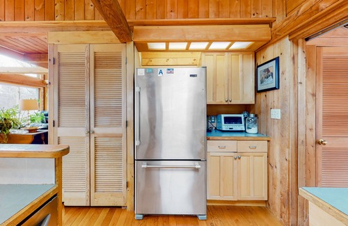 Return back home and enjoy the many amenities at your fingertips, such as the house's incredibly spacious living area, complete with a comforting cabin-like feel, knick-knacks, and a couch for you to knock out on for a quick power nap. This home boasts a beautiful balcony for you and your guests to sit out on and peer out into the forests below, a gas grill for cooking an appetizing dinner, and a kitchen table for late-night games of poker with friends under the light of a gorgeous lamp.