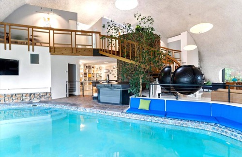 The geodesic dome boasts large windows, allowing natural light to flood the space. After a day of exploring the city's attractions, take a dip in the indoor pool, soothe your muscles in the inviting hot tub, or simply relax in one of the spacious living areas, equipped with comfortable seating and modern entertainment options.