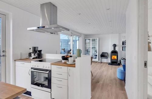Look forward to a relaxing stay in this great holiday home close to the fjord. The rooms in the house are brightly furnished and make a modern impression. The house's bathroom is small but functional. The kitchen and the cosy living room are open-plan, so you can enjoy cooking in the well-equipped kitchen without having to miss out on the company of the other guests. In the living room you can enjoy dinner together in the dining area, relax in the rocking chair or put your feet up on the sofa - all with a wonderful panoramic view of the fjord. In winter, you can also warm yourself by the fireplace.