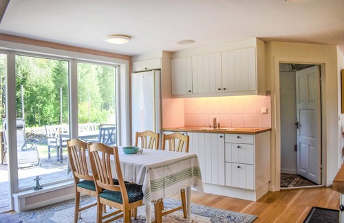 This old and welcoming vacation home in a beautiful setting with fields and large trees offers exactly what you surely want: privacy, beautiful nature for outdoor activities and cultural experiences. The rooms are cozy and bright with homey furnishings and inviting decor to create a feel-good atmosphere. The living rooms will definitely become your family's relaxation spot. Here you can enjoy nice family meals in the evening, play board games and cards and negotiate your vacation program. Go for an early morning jog, breathe in the fresh air and afterwards enjoy a hot coffee on the open blue terrace where you can chat about today's trip to the famous quarry, Svarta Bergen. On the beautiful nature plot your children can romp around nicely.