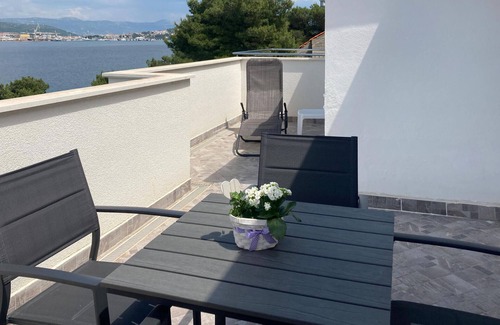 Relax on the island of iovo, where only 54 steps separate you from the sea. Enjoy the marvellous panoramic view of the sea and the mainland. In front of the holiday home is a spacious terrace, where you can spend many sociable hours outdoors having a barbecue. On the ground floor there is a living room, a kitchen and a bedroom, while upstairs there are two further bedrooms, a mini-kitchen and another terrace. There are only external stairs. Here you live close to beautiful bays and beaches and the old town of Trogir, which is also worth a visit.