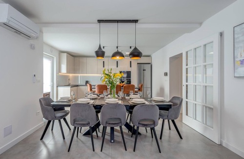 Welcome to this fantastic, modern home. Here you will look forward to your daily plunge into the heated pool, where you will be pampered by massage jets. Right next to it, take advantage of the fully equipped summer kitchen with grill to try out local dishes and specialties. All this happens in front of a wonderful scenery, here you will always enjoy a great view of the sea and the bay of Kastela.