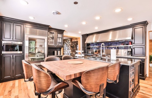 Inside, you'll spread out in 5,000 square feet of Northwoods cabin charm with modern amenities throughout. Start the day with coffee in the sunroom or on the private dock, and experience the sunrise reflecting on the lake and peaceful nature sounds. Prepare delicious meals in the exquisite new gourmet kitchen with state-of-the-art Sub-Zero and Wolf appliances. Enjoy dining with 180-degree lake and forestry views in the backdrop in the comfort of the new air-conditioning system. Need to check in at the office? Log on with our state-of-the-art Starlink high-speed, low-latency wifi. Step outside and stroll on the custom deck encircling the entire home, or take the stairs down to the firepit to enjoy some s'mores and ghost stories near the shore! Challenge your loved ones to a little friendly competition on the pool table or belly up to the vintage wet bar with copper countertops. At the end of the day, toss those dirty swimsuits and fishing clothes into the new washer/dryer. And with five newly carpeted bedrooms, there are plenty of cozy places for parents and kids lay their heads at the end of the day to rest up. A baby gate and a Pack' N Play are provided to keep younger guests comfortable and safe.