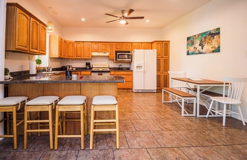 Large, fully stocked kitchen with a gas range—cook up a storm or enjoy the view from the indoor or screened porch dining areas.