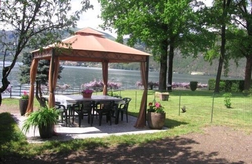 The apartment has 2 double bedrooms, 1 twin room (possibility to add 1 extra bed) and 2 single rooms joined with independent access from the corridor, 2 bathrooms (one with shower and one with bathtub), 1 kitchen fully equipped (with dishwasher). Large living room with SAT- TV (possibility to add 1 extra divan bed for 1 person) with direct access to a covered terrace for outdoor dining with wonderful view over the garden and the lake.The large and peaceful private garden leads straight down to the lake and is equipped with table, chairs and BBQ under a green pergola as well as some beach chairs. Private parking inside the property.