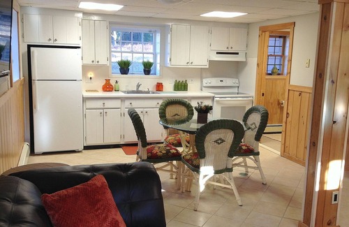 The Living Room is also part of the Great Room and includes a comfy U-shaped Raymour & Flanigan leather couch & sleeper sofa and two Barcalounger Leather Recliners. Relax and watch 100+ cable TV channels, listen to music using our Sirius Satellite Radio, and watch the glow of the fire!