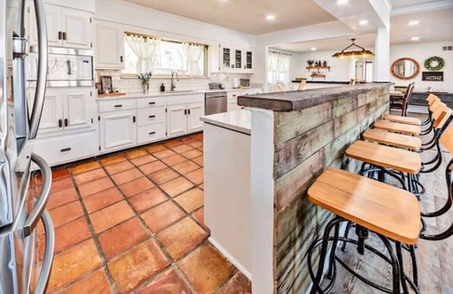 Enjoy a nice warm cup of coffee with a side of cookies provided to our guests. Chefs will appreciate the well appointed kitchen, large enough to fit a team of cooks, it is outfitted with sleek granite countertops and a full suit of appliances. Guest can watch and enjoy a panoramic view on a 20+Ft wrap around peninsula with 7 barstools or sit in dining table which accommodates another 8 people, perfect for a gathering of family and friends. Dining room/open concept connected to kitchen & living room spacious dining room.