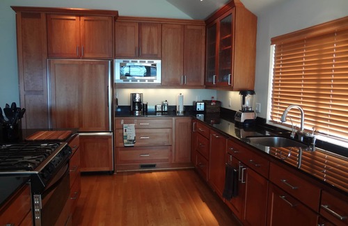 Great Room Layout: The main living space is light and airy, arranged in an open floor plan with vaulted ceilings. Leather couches ground the living room and provide a cozy space to curl up and read, work on a laptop, watch cable TV, or enjoy the gas fireplace. From the living room, sliding doors open unto a large view deck which overlooks Alki Beach and has 180 degree views of the Puget Sound and Olympic Mountains. You'll love using the gas grill to cook the fresh salmon you bring back from the Pike Place Market. Prepare the rest of your dinner in the gorgeous designer kitchen with cherry cabinets, granite counters and stainless appliances-at the heart of the great room, then gather around the long dining table to savor a bottle of wine and great company. In the morning, enjoy a cup of freshly ground Pike Place Roast coffee while gazing at the view from the bar or cocktail table.