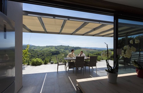 Nestled in the heart of Kozana village, our modern villa offers a serene escape. Perched atop a hill in the picturesque Goriška Brda region, it boasts sweeping vistas of lush vineyards and nearby woodlands. Each floor features expansive panoramic windows, inviting the beauty of nature indoors. Whether you’re sipping wine on the terrace or gazing out from the cozy living room, the view is nothing short of mesmerizing. Welcome to Villa Eva!