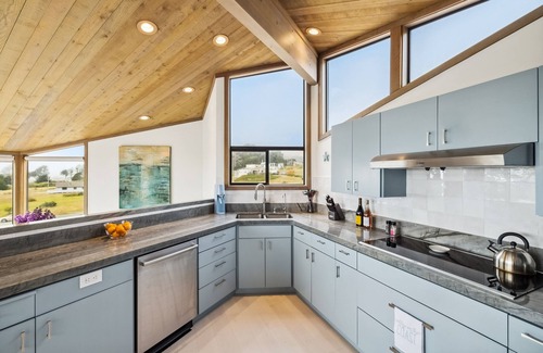 Designed by noted Sea Ranch architect and Bodega Bay resident J. Carson Bowler, this architectural gem full of open spaces and windows offers beautiful views of the coastal meadow, the open ocean, and spectacular sunsets. This is a place for days spent collecting seashells, reading by the fire, and unwinding in the hot tub beneath star-filled skies.