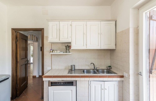 You will be staying in a 6-room villa on the ground floor. The living/dining room features beautiful furnishings, including a sofabed, an open-hearth fireplace, a TV, and a fan. It also has an exit leading to the garden and terrace. There is one double bedroom on the ground floor with an exit to the patio. The kitchen/living room is well-equipped with a dishwasher, 5 gas rings, a toaster, a kettle, a microwave, and an electric coffee machine. The ground floor also has a shower room with a bidet and WC. Upstairs, you'll find three large double bedrooms with panoramic windows and another double bedroom with one bed. There is also another shower room with a bidet and WC on the upper floor. The villa offers a beautiful view of the garden.