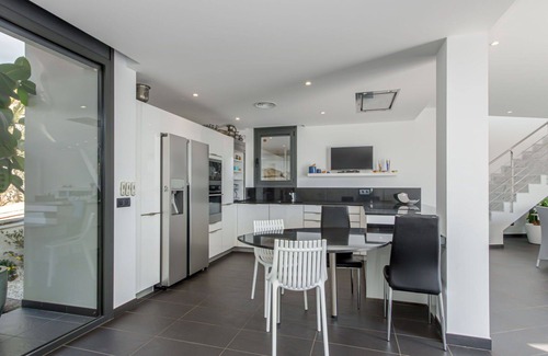 This is a 6-room villa spanning 308 square meters across two levels, recently renovated with modern and stylish furnishings. On the ground floor, you'll find a spacious living/dining room with a panoramic window, dining table, satellite TV, air conditioning, and forced-air heating. It leads out to a terrace, swimming pool, and enjoys south and west-facing positions. There's also a large room with a French bed (160 cm, length 200 cm), a bathroom with shower, WC, and double hand-basin, air conditioning, and forced-air heating, providing access to the terrace. An office with a panoramic window, air conditioning, and forced-air heating also leads out to the terrace and pool. The large kitchen is equipped with an oven, dishwasher, 3 ceramic glass hob hotplates, toaster, kettle, microwave, freezer, and electric coffee machine, with a convenient hatch. There's a separate WC as well. Upstairs, you'll find another room with a French bed (160 cm, length 200 cm), air conditioning, and forced-air heating, leading to a patio. An additional room has 2 beds (90 cm, length 200 cm), air conditioning, and forced-air heating, also with patio access. The highlight is a large room with a dressing room, a French bed (180 cm, length 200 cm), a bathroom with shower, WC, and double hand-basin, air conditioning, and forced-air heating, leading to a terrace.