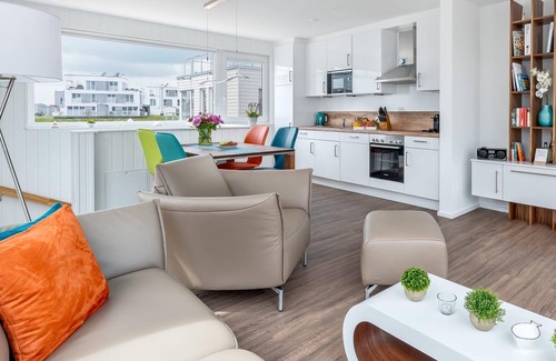 As sporty as it sounds, you don't have to be a sports enthusiast to feel at home in this exclusive holiday apartment. There is a sauna with a view of the water and a spacious bathroom with a floor-level shower with hand and overhead shower and Kneipp hose.
