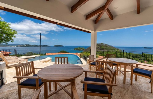As you enter Villa Playa Penca, you'll be greeted by beautiful ocean views in a spacious living room. Floor-to-ceiling sliding glass doors open to a balcony that stretches the length of the villa, providing stunning views and ample space for relaxation. The hardwood dining table offers magnificent vistas of Potrero and Flamingo Beaches, creating a true paradise experience.