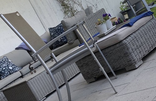 Spectacular mountain and lake views from modern and stylish 3 bedroom apartment. Close to winter sports areas and offering excellent hiking and mountain bike opportunities, even from the back door! The bright and open apartment has 3 good sized bedrooms, modern kitchen, and fireplace. Stunning views both from a balcony and separate terrace garden. Back garden gate leads directly into forest and a hiking path. 10 minutes from the charming city of Thun by car or bus, which runs every half hour.