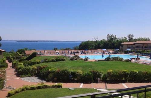 The internationally renowned Garda Golf is less than 2 km away. Inside the residence there is a large swimming pool, with a 360 degree lake view accompanied by umbrellas and sun loungers, divided into three communicating areas: adult area 25X18 height 1.40, children's area 10X6 height 0.50, whirlpool area 6X3 height 0.90. The swimming pool is supervised by bathing attendants in the period from 15 June to 15 September. In the structure there are: a large barbecue area equipped with tables and chairs for outdoor lunches and dinners, children's playground, games room with table football and ping-pong table, soccer field, beach volleyball. The apartment, also ideal for families with children, enjoys a magnificent lake view and is equipped with every comfort: air conditioning, Wi-Fi included, satellite TV with Astra. The kitchen is fully equipped: induction hob, dishwasher, toaster, kettle, coffee maker, microwave. In the living room there is a double sofa bed. The bathroom includes a shower, bidet and washing machine. A garage included in the price completes the equipment. The residence is completely closed. It is equipped with cameras and is monitored by a caretaker. It is located just 150 meters from Porto Dusano where there are bars and restaurants by the lake and where it is possible to rent motor boats and take advantage of a public maritime transport service to reach the most famous places of Lake Garda (Sirmione, Salò , Desenzano, Riva del Garda, Gardone Riviera, Limone, Peschiera, Lazise). From the residence you can easily reach: the famous white beach, Porto Dusano, Porto Torchio, La Rocca di Manerba and its natural park, the prestigious internationally renowned Garda Golf Country, the Sirmione peninsula with its famous spas, the characteristic Salò and the Vittoriale of Gabriele D'Annunzio, the famous lakefront of Desenzano, the amusement parks of Gardaland and Caneva Word. A short distance away are the most famous tourist cities of Venice and Verona.