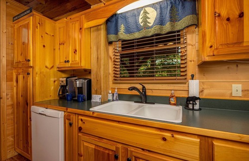 The kitchen with it's butcher block island is roomy and well appointed to handle any of your cooking needs. Bear themed dishes and cutlery make every meal special.