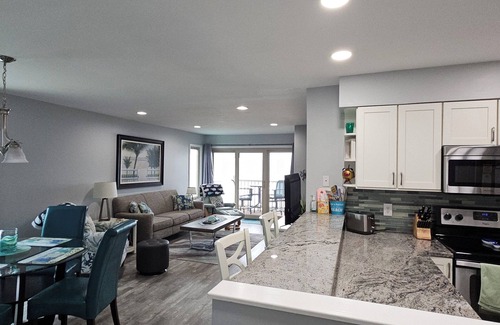 New modern gray vinyl plank flooring added in 2019 lead you from the front door to the Private Oceanfront Balcony. Both the Master & Guest Bathrooms have been updated including Ceramic Tile, Vanities and solid surface counter-tops. Extra storage shelves in each shower area also make it convenient to store your toiletries and hang towels. The fully equipped Kitchen has white maple shaker style cabinets, stunning granite counter-tops and contemporary glass tile backsplash. Stainless steel appliances cap off the kitchen's modern appearance.