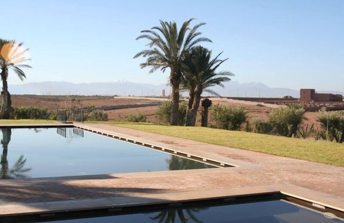 Built in 2008 in a rocky desert,15kms south of Marrakech, overlooking the Atlas mountains, this beautiful villa boasts a contemporary Moroccan style with 6 doubles bedrooms, 5 bathrooms, 100 sqm reception area, 2 patios, many terraces including a beautiful roof terrace, a pool house and two charming bungalows which can sleep up to 4 people each.