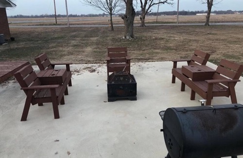 This lodge is close to town but outside the city limits. So you have a large yard but easy access to everything town has to offer. The house has everything you need from a fire pit to a pool table. 4 bedroom with 3.5 bathroom leaves plenty of room for everyone to spread out. The house has 12 beds only 2 of which are bunk beds so there are plenty of single beds in the house. The living room also has 3 couches so that everyone has plenty of seating room.