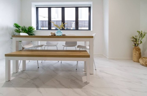 The three-story property boasts two luxurious and spacious bedrooms with 1 King bed and 2 King single beds, beautiful soft furnishings, and hotel quality linen. All bedrooms have block out blinds for a peaceful night's sleep. The modern full bathroom on the third floor features a bidet toilet with a heated seat, tiled shower, vanity, and storage.