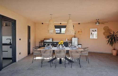 On the ground floor there is an open plan living area with glass doors leading onto the terrace, pool and outdoor kitchen. Modern design with neutral colors and natural materials is combined with simple lines. The result is a very pleasant space, especially the living area. Here you will find a comfortable sofa, a smart TV and a desk. A dining area with a large table for 8 people and the option to add 2 child seats leads you into the kitchen. The modern kitchen is fully furnished and features a large kitchen island with an induction hob, making preparing meals a pleasure.
