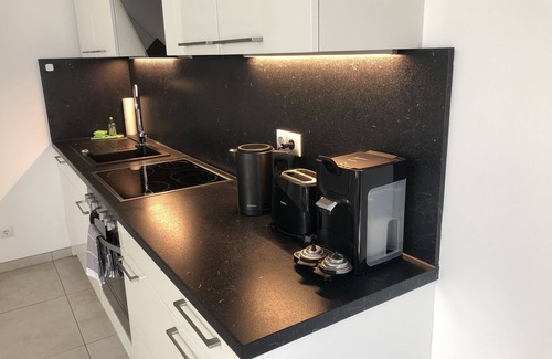 In addition to a leather sofa, the living area also offers a modern television. The kitchen is equipped with a fridge / freezer, dishwasher, ceramic hob, oven, kettle and coffee machine. An extensive range of cookware and dinnerware is also offered. A dining table is also available here. In the sleeping area you will find space in a 1.60 m wide bed and a baby bed can also be placed here. The modern bathroom has a shower, an illuminated mirror and a toilet. You will also find a hairdryer.