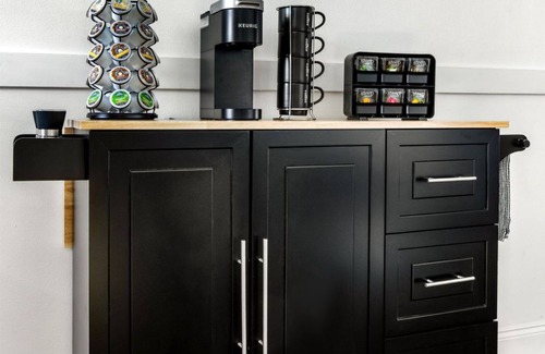 The kitchen is fully stacked for all your cooking needs during your stay. The coffee cart offers a variety of K-cups, ground coffee, and tea. Along with sugar and creamer that will give you your caffeine fix in the mornings.