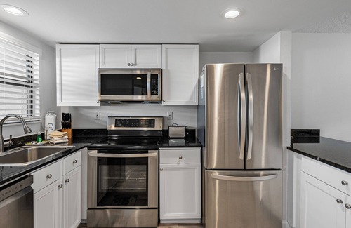 • Kitchen is fully stocked with a coffee maker, blender, toaster, mixer, all pots & pans, dishes, and cutlery