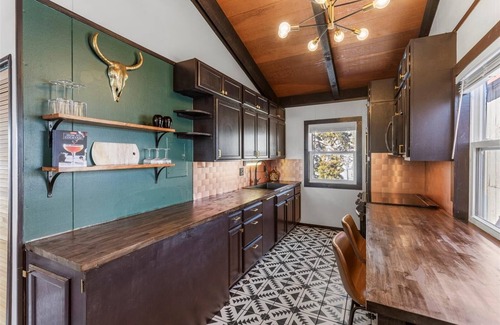 Inside, comfort meets functionality with two bedrooms accommodating up to five guests. The master bedroom features a queen-size bed, custom built-in cabinetry, and a designated work space/vanity. Meanwhile, the second bedroom is perfect for families or groups with a bunk bed sporting a full-size mattress below and a twin above.
