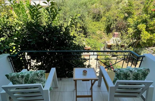 - 2 terraces: Terrace 1 is west-facing with a panoramic view of the Ionian Sea and the islands of Corfu, Paxos & Antipaxos including 2 high-quality sun loungers with a table and a pergola as a privacy screen to the neighbor; Terrace 2 is on the east side of the wooded hill and the quiet back garden, also with a table and two rocking chairs.