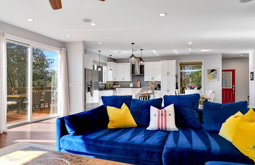 With three bedrooms and two and a half bathrooms, our home can accommodate up to ten guests in luxurious comfort. The master bedroom is a true oasis, with a comfortable king-size bed, flat-screen TV, and en-suite bathroom. The second bedroom also boasts a king-size bed, while the third offers a queen-size bed and twin loft bed, both with access to a shared hallway bathroom. For even more sleeping arrangements, the office includes a sleeper sofa, and the main living area huge couch 55" inches deep! Each of the bedrooms feature large windows that let in plenty of natural light and stylish décor, creating a warm and inviting ambiance.