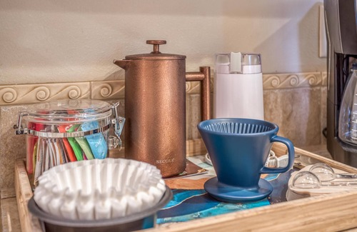 Kitchen: Refrigerator w/icemaker, dishwasher, oven, microwave, and coffee station. Fully stocked.
